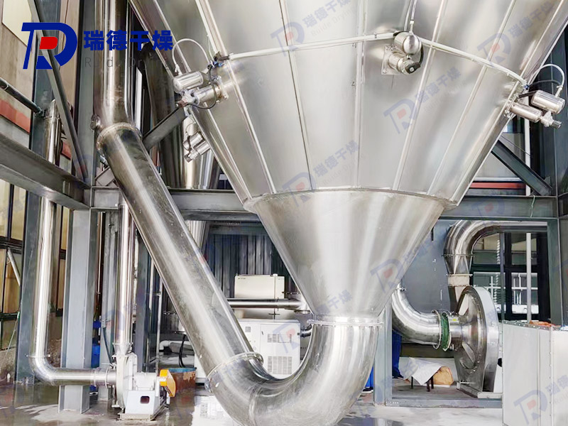 The feed liquid is input under high pressure through a diaphragm pump, spraying mist like droplets, and then flowing down in parallel with hot air. Most of the powder particles are collected by the bottom discharge port of the tower, and the exhaust gas and its small powder are separated by a cyclone separator. The exhaust gas is discharged by a fan, and the powder is collected by a pollination tube located at the lower end of the cyclone separator. The fan outlet can also be equipped with a secondary dust removal device, with a recovery rate of over 96-98%.